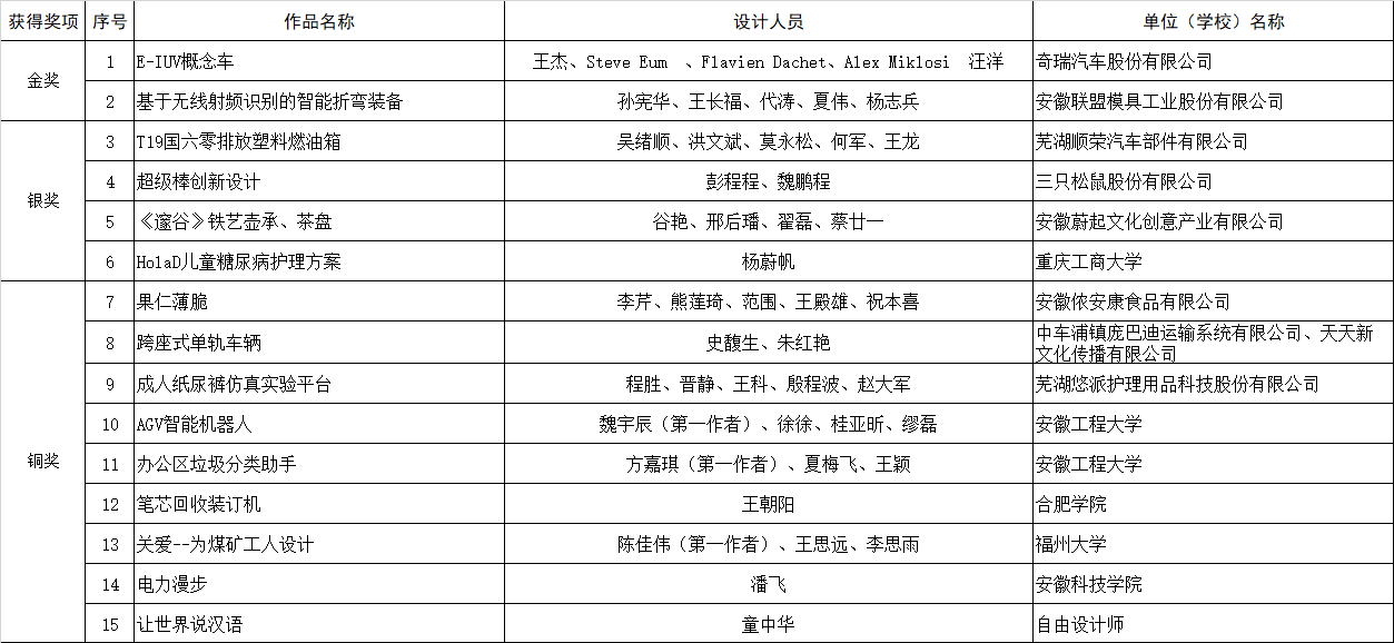 最終,來自奇瑞汽車的E-IUV概念車(概念設(shè)計(jì))與安徽聯(lián)盟模具工業(yè)有限公司的基于無線射頻識別的智能折彎裝備( 實(shí)物產(chǎn)品)榮獲本次大賽金獎,從設(shè)計(jì)理念、產(chǎn)品外形、先進(jìn)技術(shù)在產(chǎn)品中的應(yīng)用以及解決行業(yè)痛點(diǎn)等關(guān)鍵問題上,以上作品在行業(yè)中均處于領(lǐng)先水平。同時(shí),來自順榮股份、三只松鼠、美的冰箱、中車龐巴迪(蕪湖)、安徽工程大學(xué)、安徽工業(yè)大學(xué)等企業(yè)、高校投稿作品也在本次大賽中取得了優(yōu)異的成績。